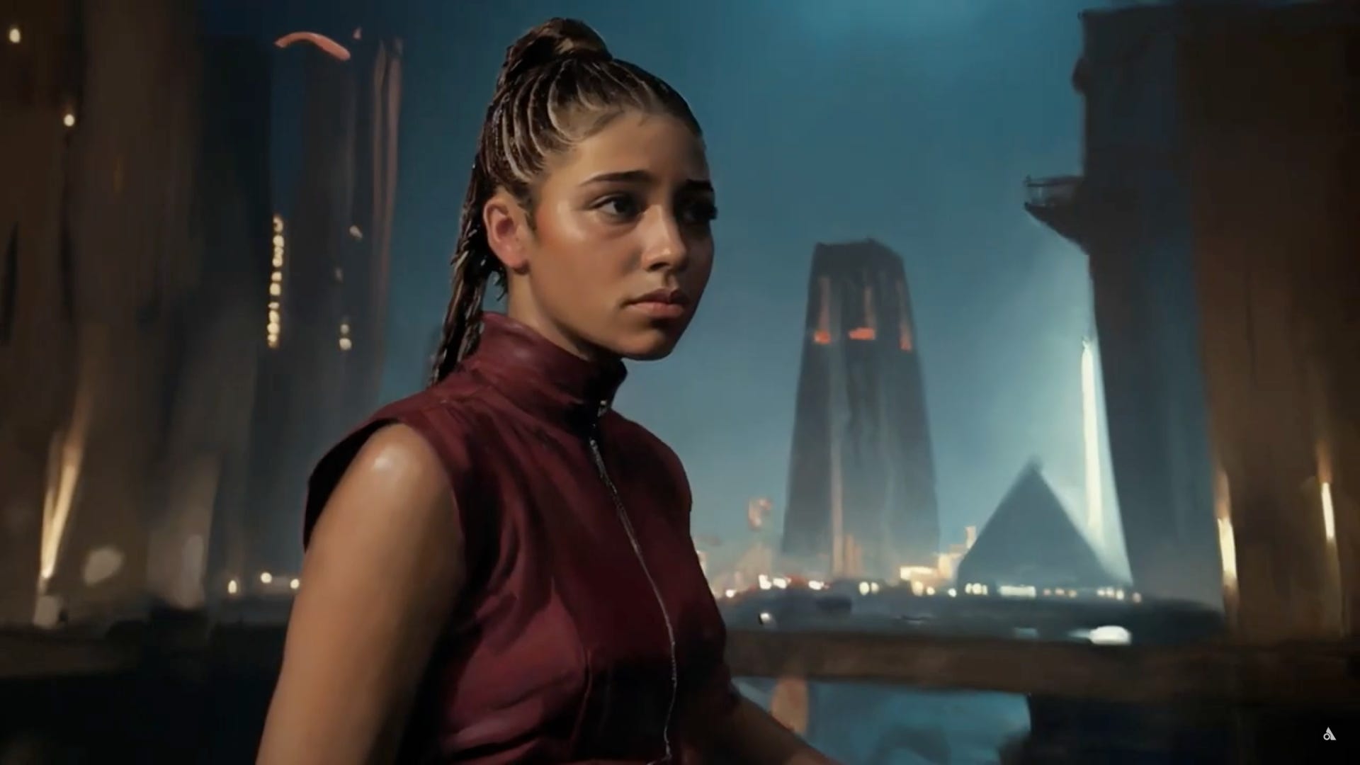 This confusion of place is reflected in a later image of one character looking out across a cityscape of scattered pyramids and a building that looks more like Burj Khalifa than anything in Cairo’s skyline. (I reverse-image-searched a screenshot to see if I was missing any architectural landmarks in Egypt, but all that came up were other AI-generated buildings tagged with keywords like “dark” and “futuristic,” plus a scene from Mortal Kombat Deception.) While the people depicted in the video seem to be related to characters from the opera, none resemble any of the cast members. It is, in the words of Eve Polastri, “not good.”