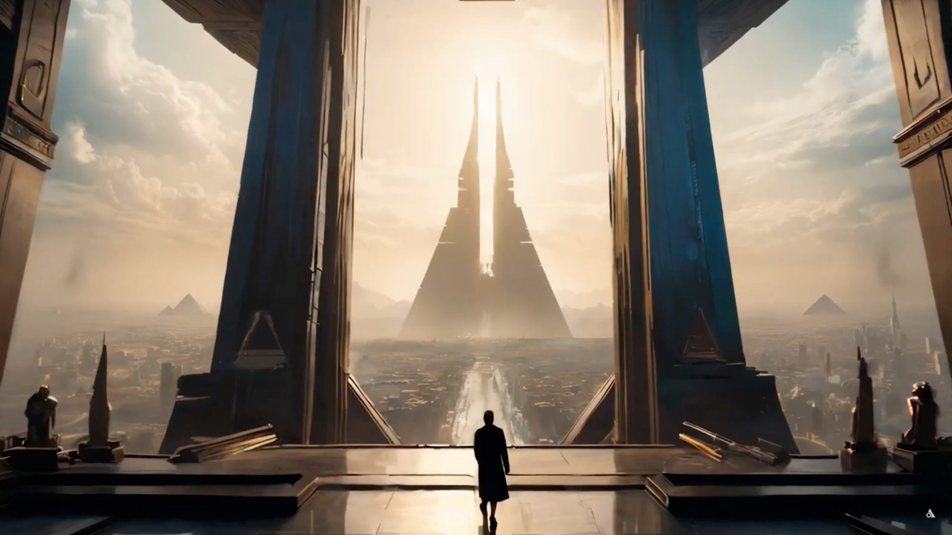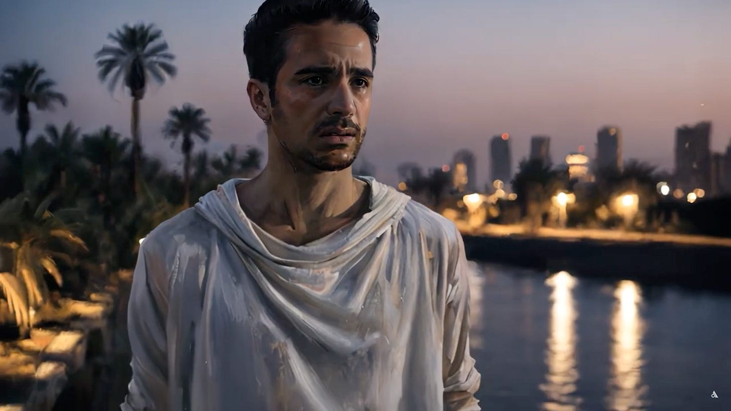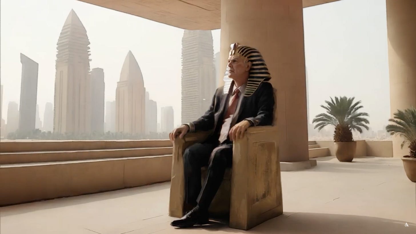 This pitch is set against previews of the film that look like a patchwork of cinematic blockbusters (Black Panther, Dune, Blade Runner) rendered in that uncanny valley style of generative AI. There are layers of “ancient” and “modern” Egypt, exemplified in a visual of what appears to be the King of Egypt in a crisply-tailored business suit paired with a nemes, seated against a backdrop that looks more like Dubai than Cairo.