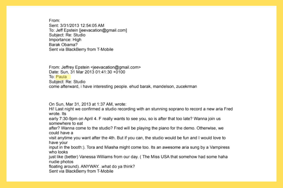 In 2013, an email exchange with a woman identified only as Paula begins with an invitation to Epstein: