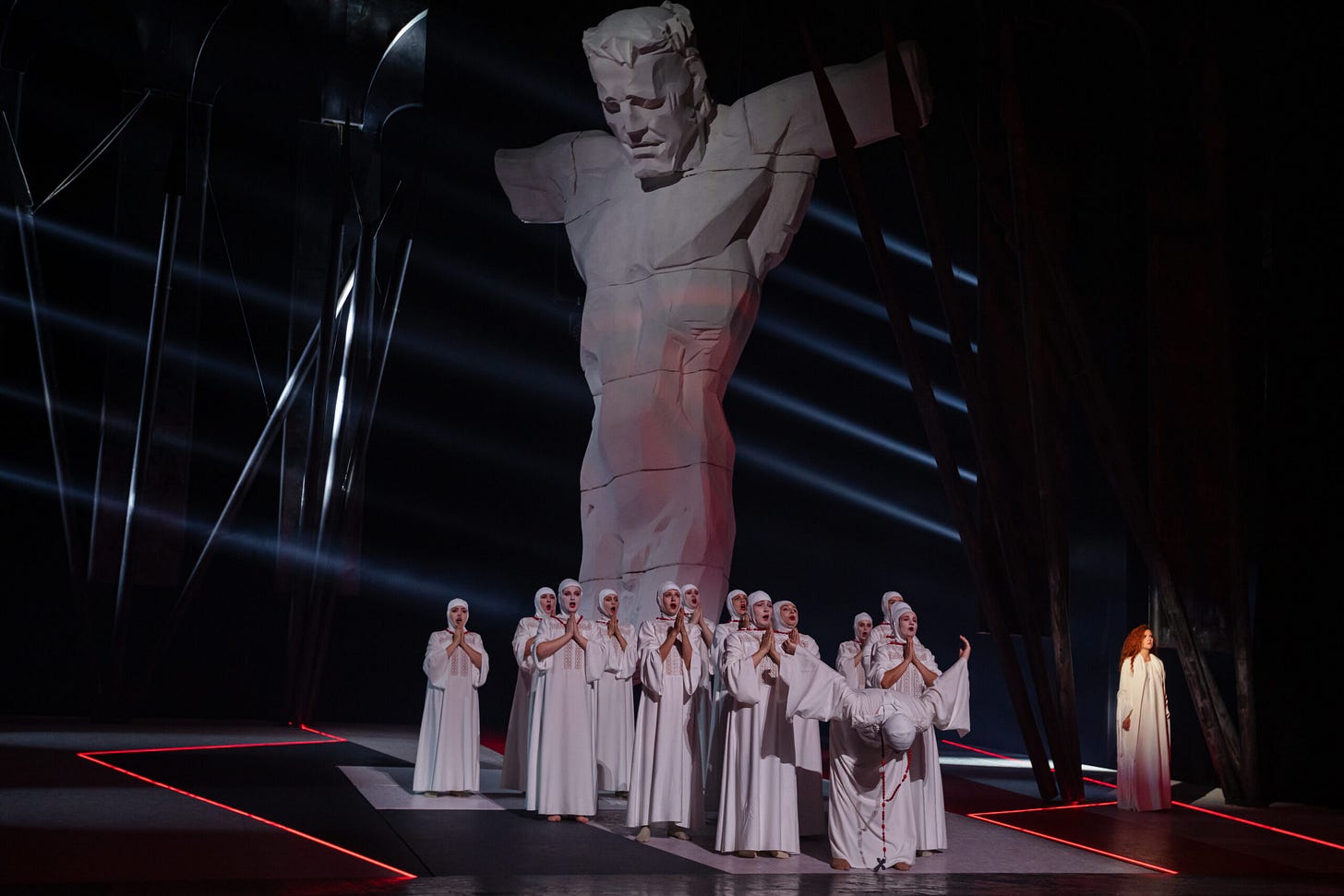 For that piece, I saw two operas, Yuliy Meitus’s Stolen Happiness, and Verdi’s Nabucco, both staged with paint-by-numbers precision and tradition. I found this approach less effective for Nabucco, which felt stuck in the 1960s. Most of this played out like come-to-life versions of old Babylonian reliefs, while heroine Fenena’s dress — a long, caped chiffon number that was the same shade of powder blue as the mezzo-soprano’s eyeshadow — felt like something sketched by Oleg Cassini for Jacqueline Kennedy. As I wrote in November, I had expected the performance of “Va pensiero” to resonate with audiences given the parallels it presented between occupied people, especially after interviewing several chorus members of the LNO. However, when I asked a 20-something couple in my row about this, one of them seemed more taken with the love story between Fenena and Ismaele. Part of me wonders if that was in part due to how set apart Fenena was, sartorially, from the rest of the cast.