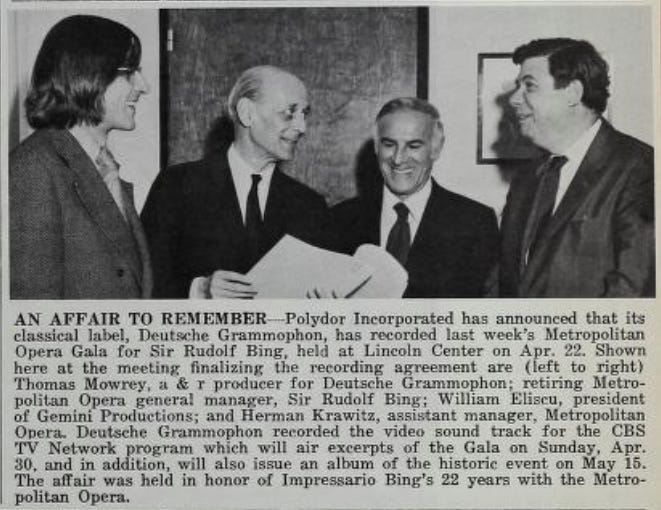 Given that Krawitz was a leader in bringing the Met into conversation with its neighbors at Lincoln Center and familiar with the New York that existed beyond the opera house, it’s hard to believe he wasn’t at least integral to the performances. If nothing else, we can rule out that this was the brainchild of Bing (although according to one report he listened to the LP and enjoyed it, he doesn’t mention the show in either of his memoirs).