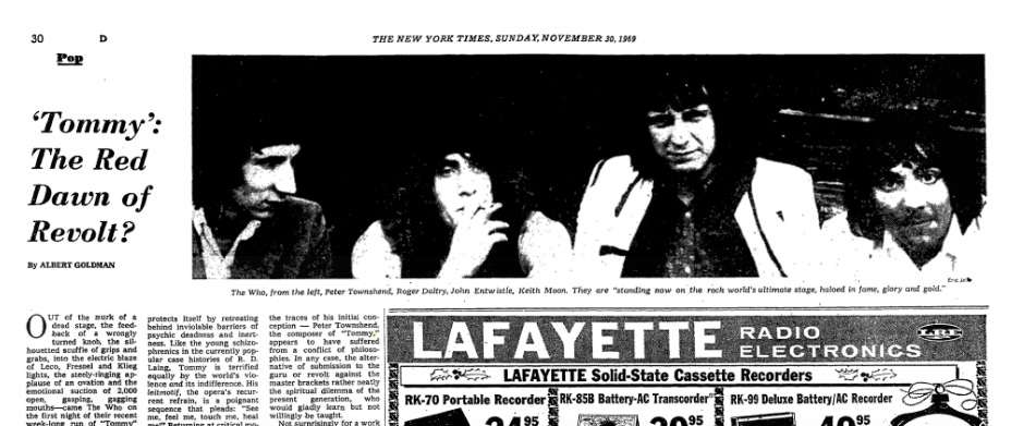 Henahan, meanwhile, was less sold on Tommy as an opera, despite Goldman’s connections to Verdi, Wagner, Mozart, and Beethoven in November of ‘69. “The hour-long piece… could hardly qualify as opera under any except the most propagandistic definition,” Henahan wrote in the opening of his review, while later admitting that the work “proved a lot of innocent fun.”