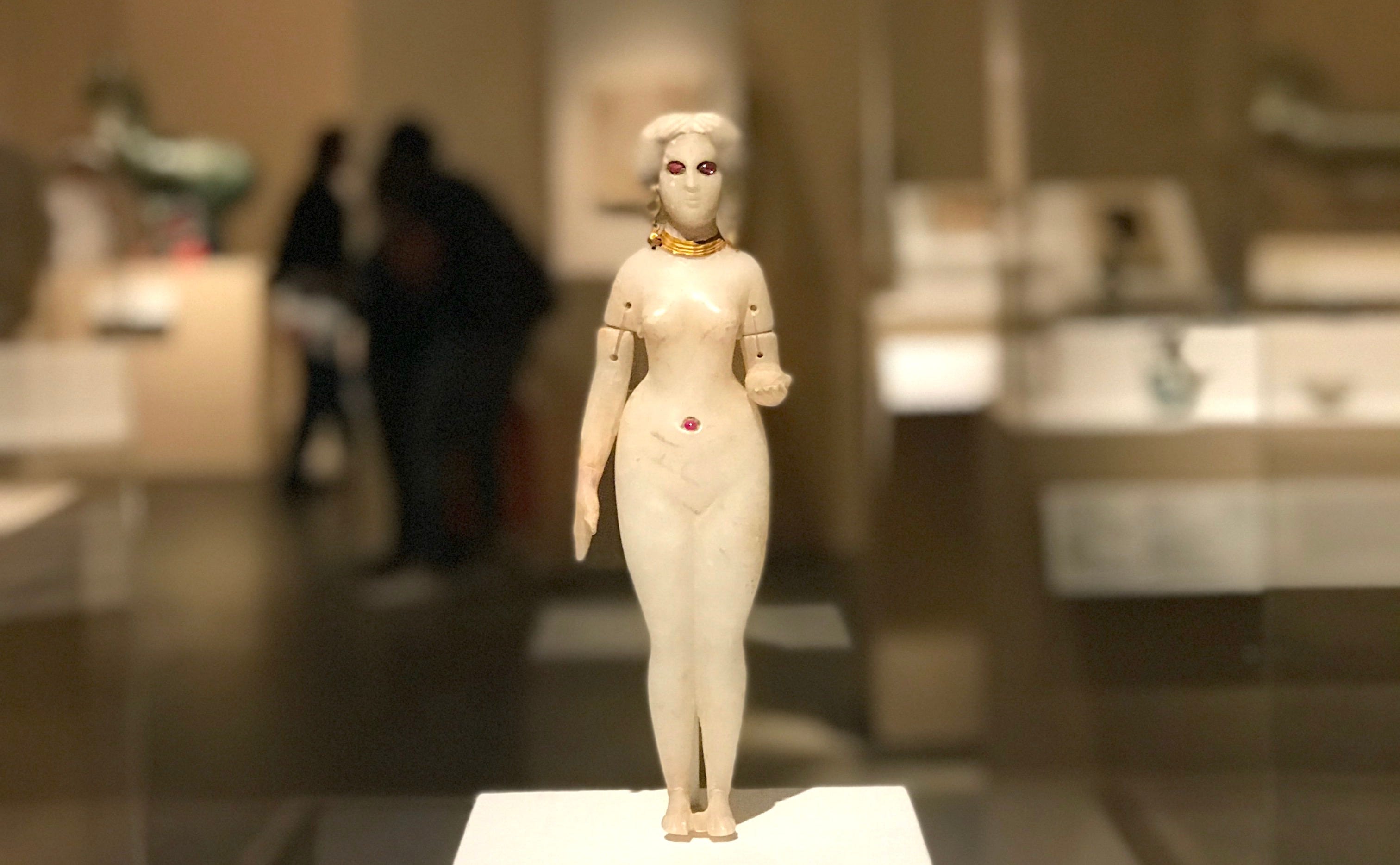 Statuette of alabaster goddess, from Babylon, with movable arms and ruby eyes & navel (Photo: Olivia Giovetti)
