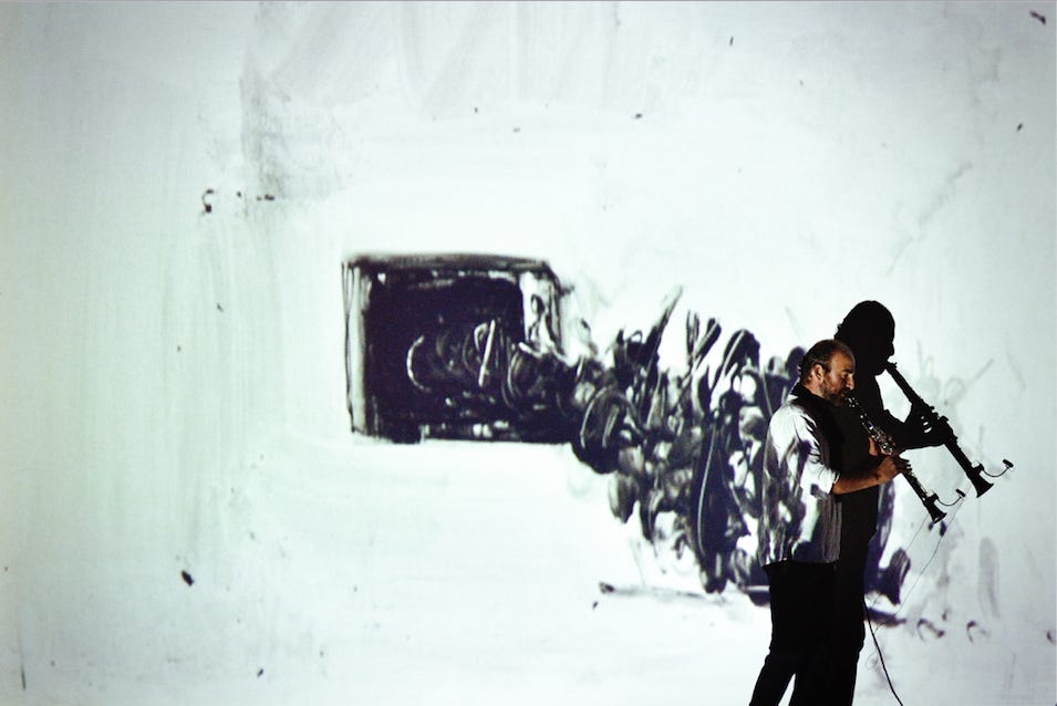 Kinan Azmeh, with artwork by Kevork Mourad, in Home Within. (Photo: Kinan Azmeh)